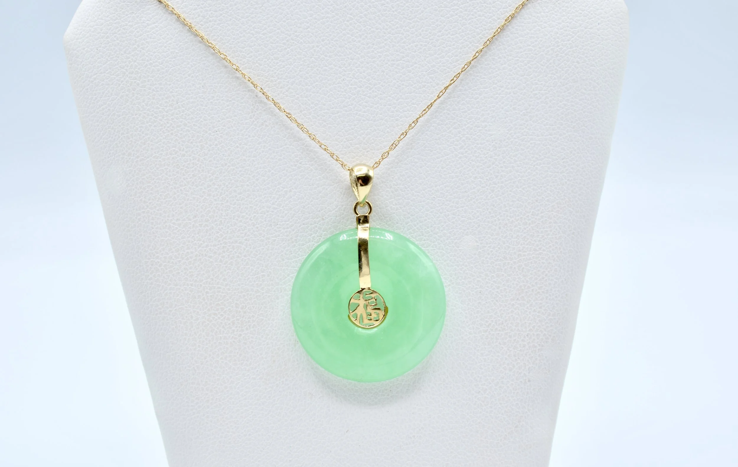 14K Vintage Yellow Gold Round Disc Green Jade Good Fortune Pendant Necklace.
