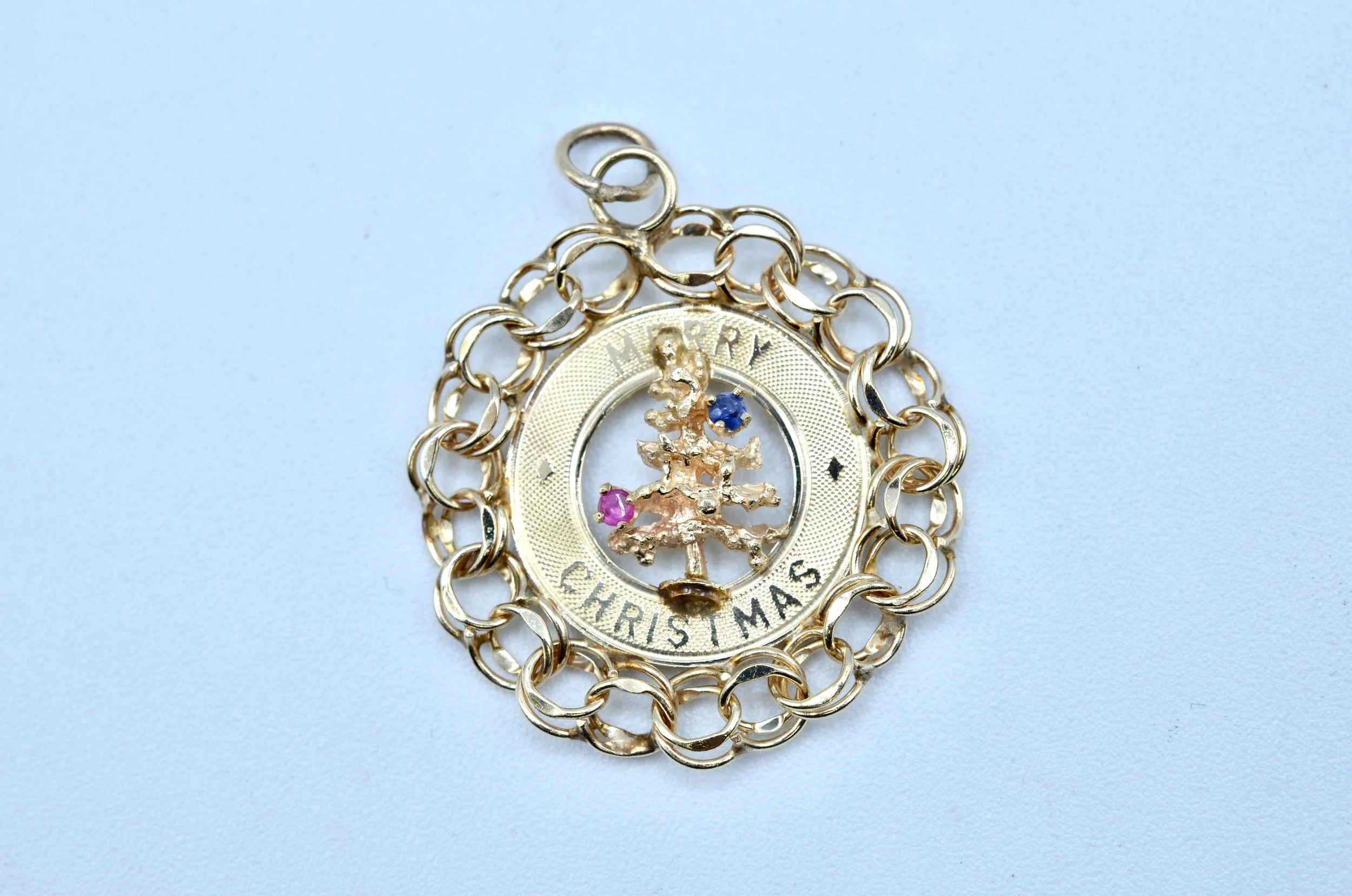 14k Vintage Gold And Gemstone Merry Christmas Charm/Pendant.~~3.7gr