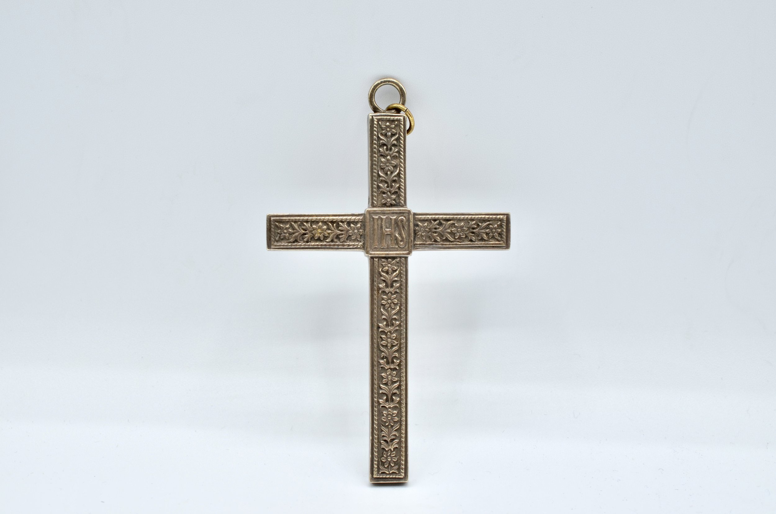 Antique IHS Cross Pendant – Ornate Engraved Floral Christian Cross.~~36.6gr
