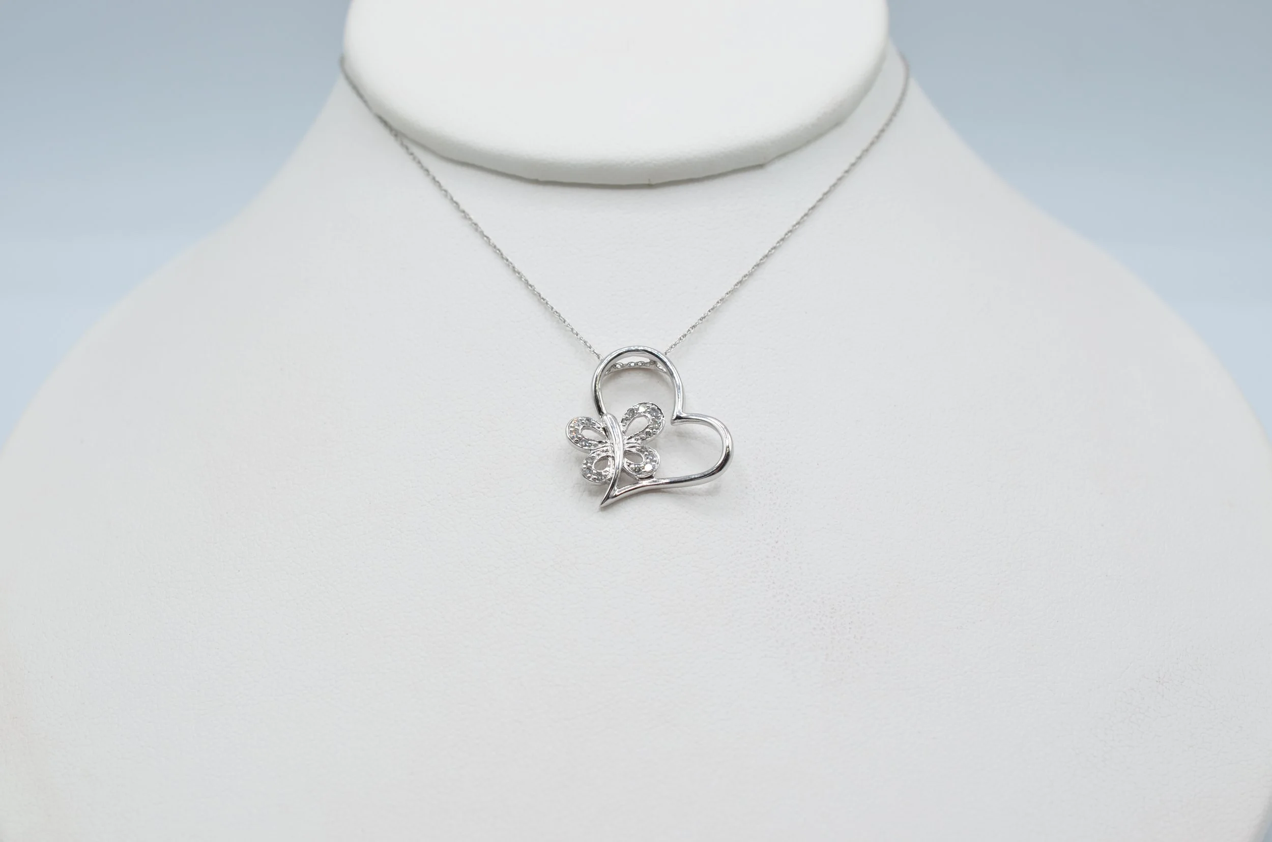 10k White Gold And Diamond Butterfly Heart Pendant And 14k White Gold Chain.