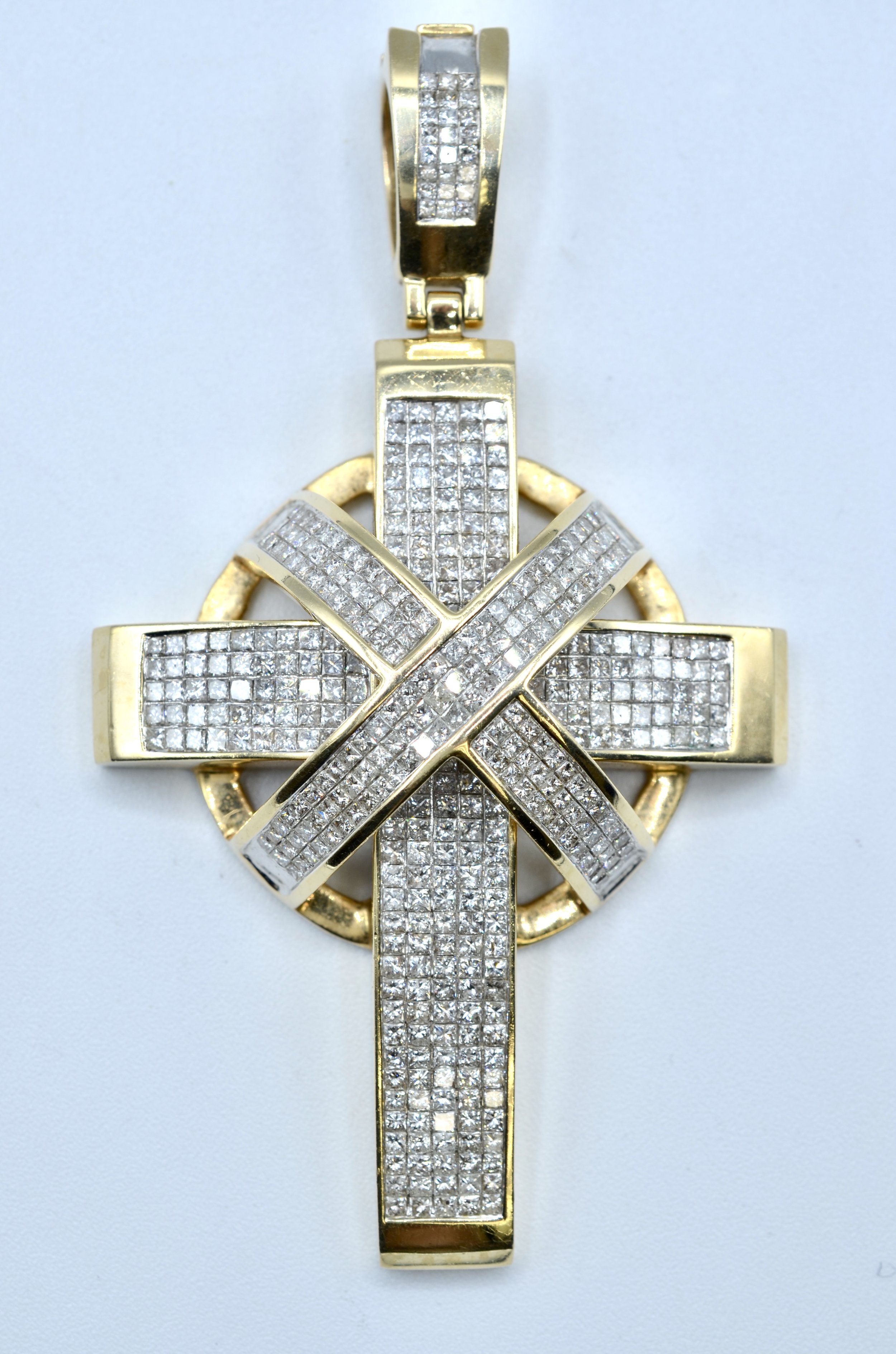 14k Gold Invisible-Set Princess Cut Diamond 15TCW Cross Pendant – 62.6g