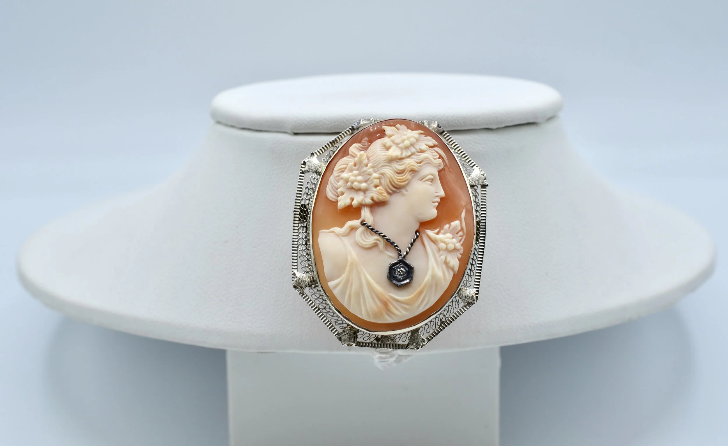 Vintage 14K White Gold And Diamond Cameo Pendant / Brooch.~~13.4gr