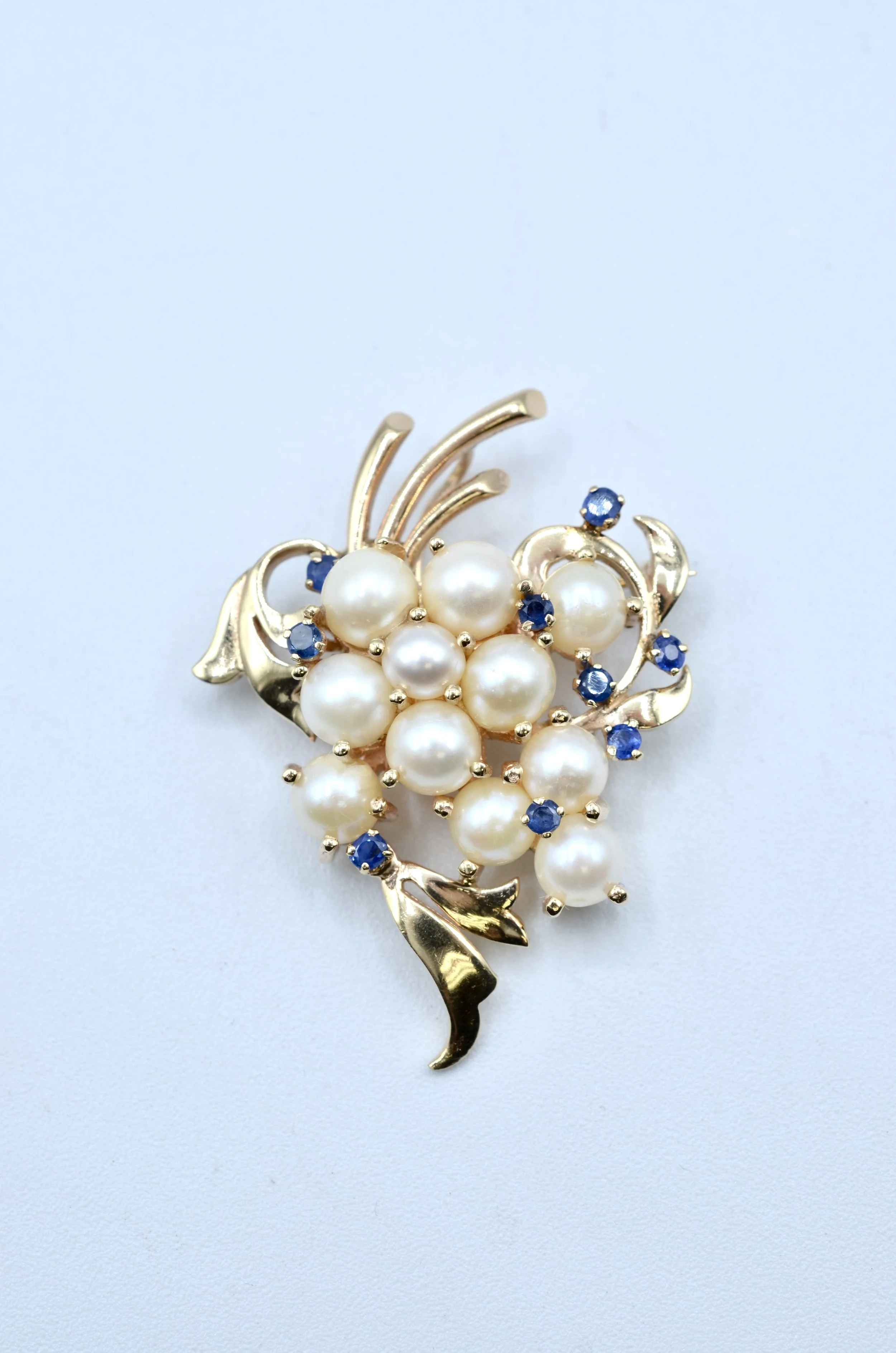 Vintage 14k Yellow Gold Floral Cluster Pearl & Sapphire Brooch Pin –16.3G