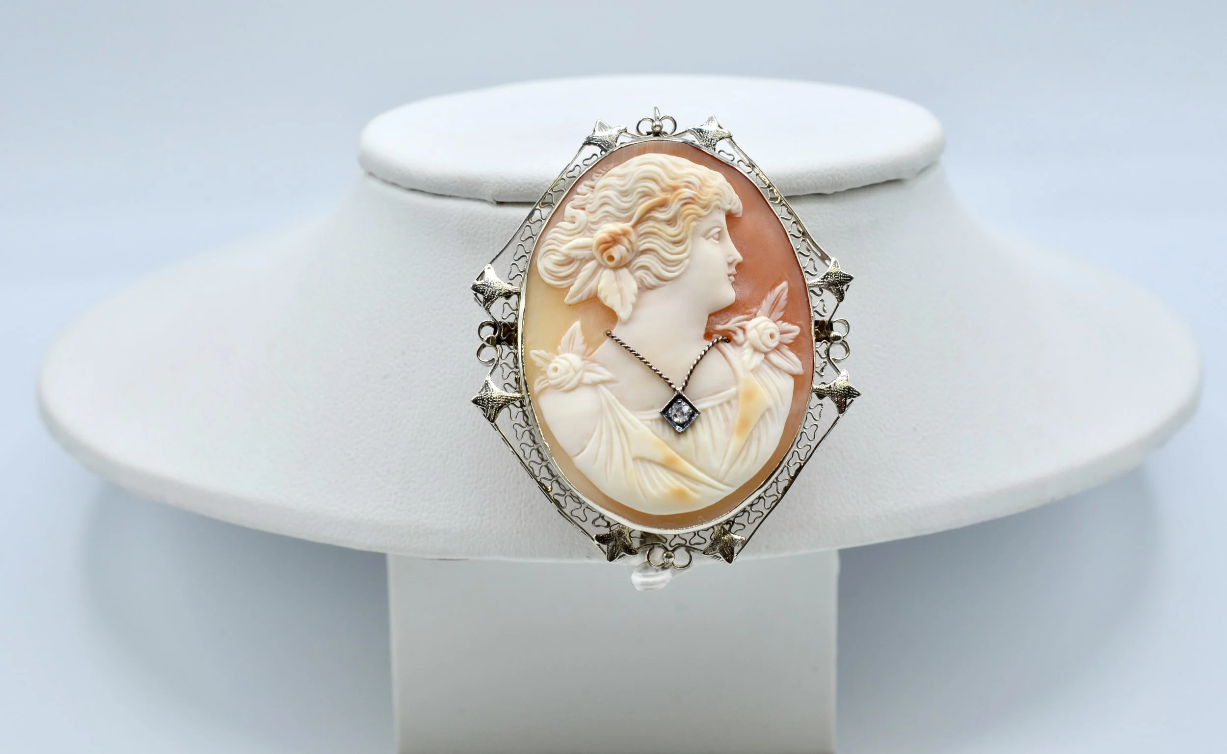 14K Vintage White Gold And Diamond Cameo Pendant / Brooch. ~~11.5gr