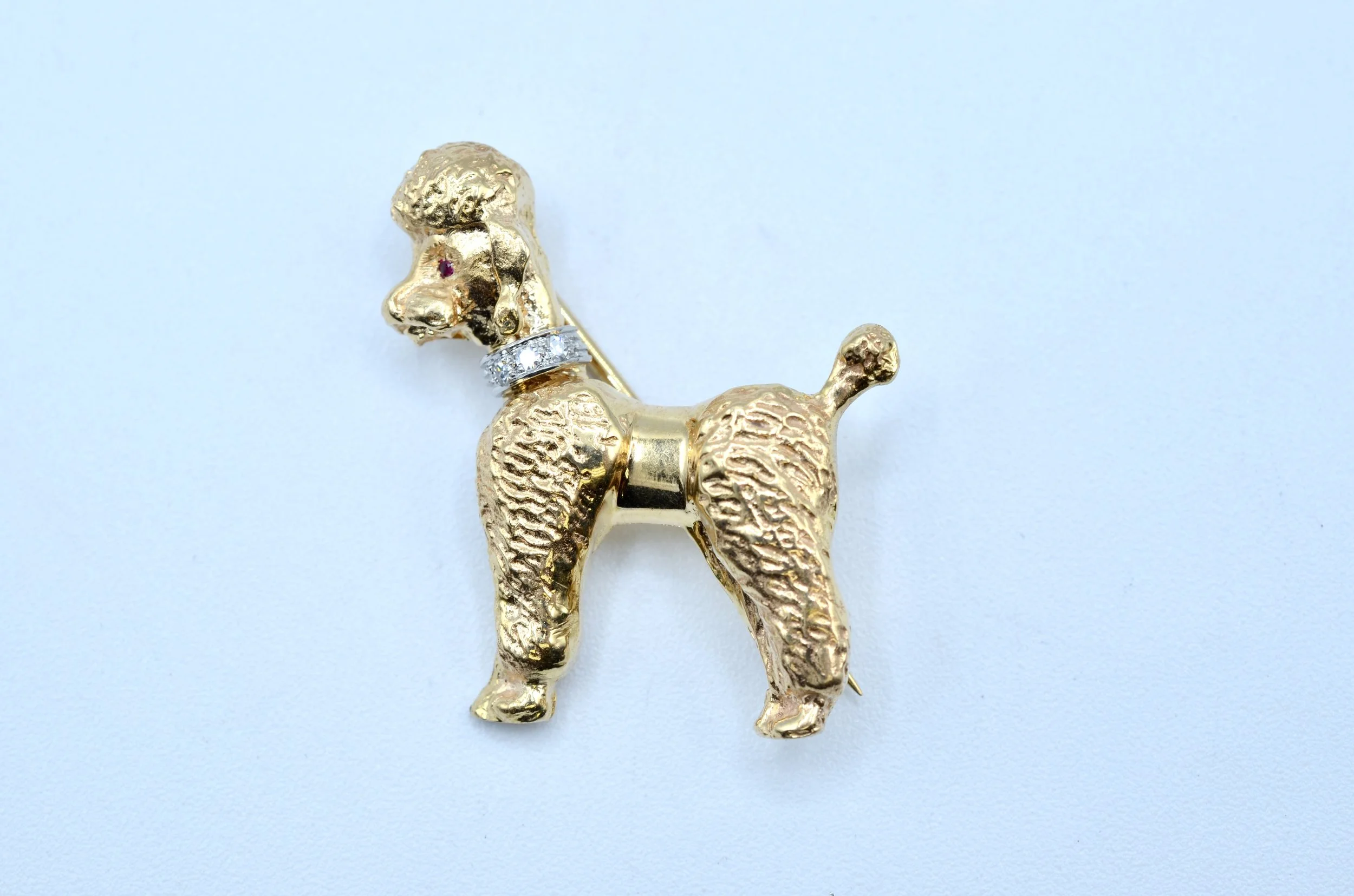 14k Vintage Gold Brooch French Poodle Dog Diamond Collar & Pink Gemstone.~13.4gr