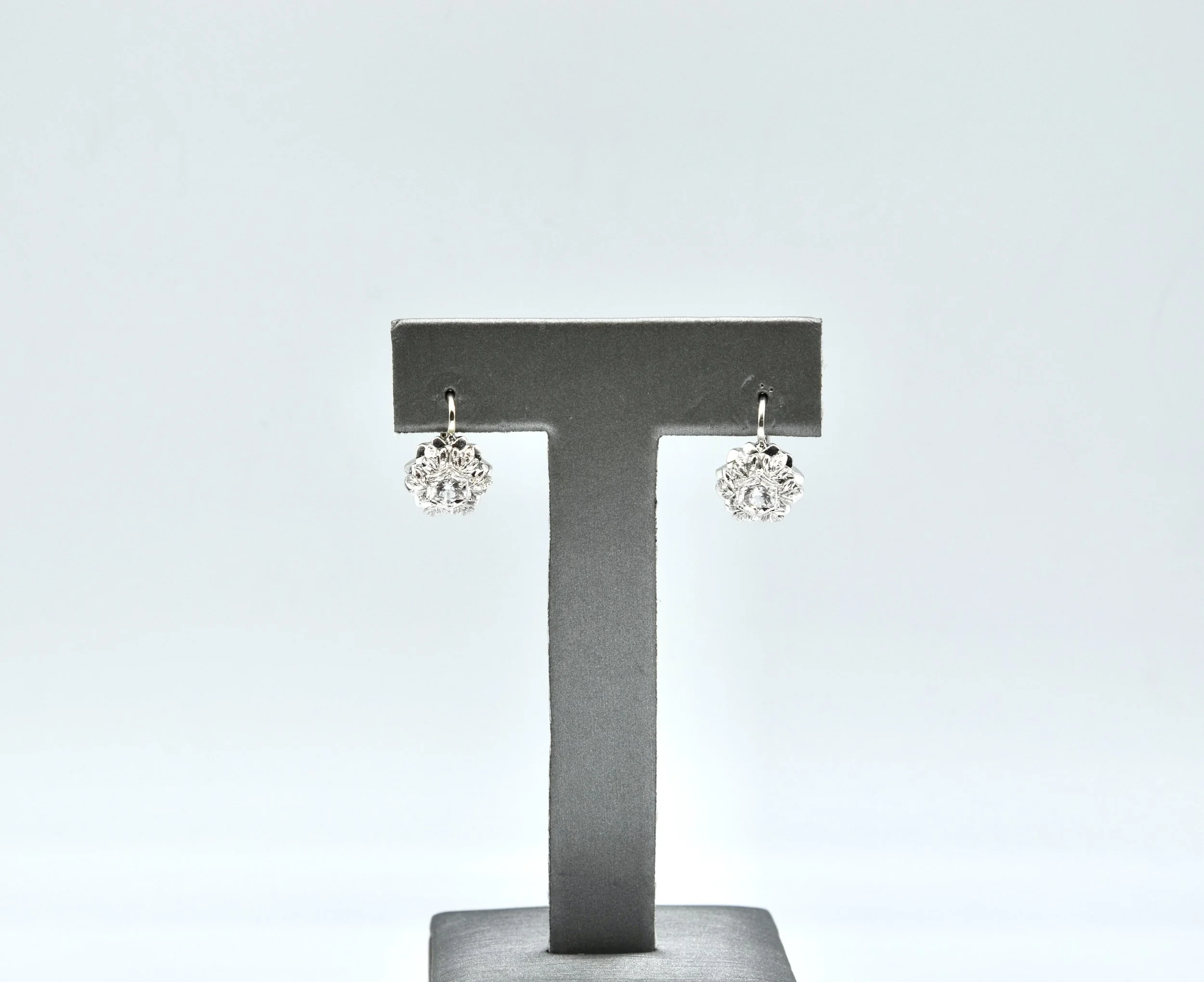 14k Vintage White Gold And Cubic Zirconia Leverback Floral Earrings.~~5.5gr