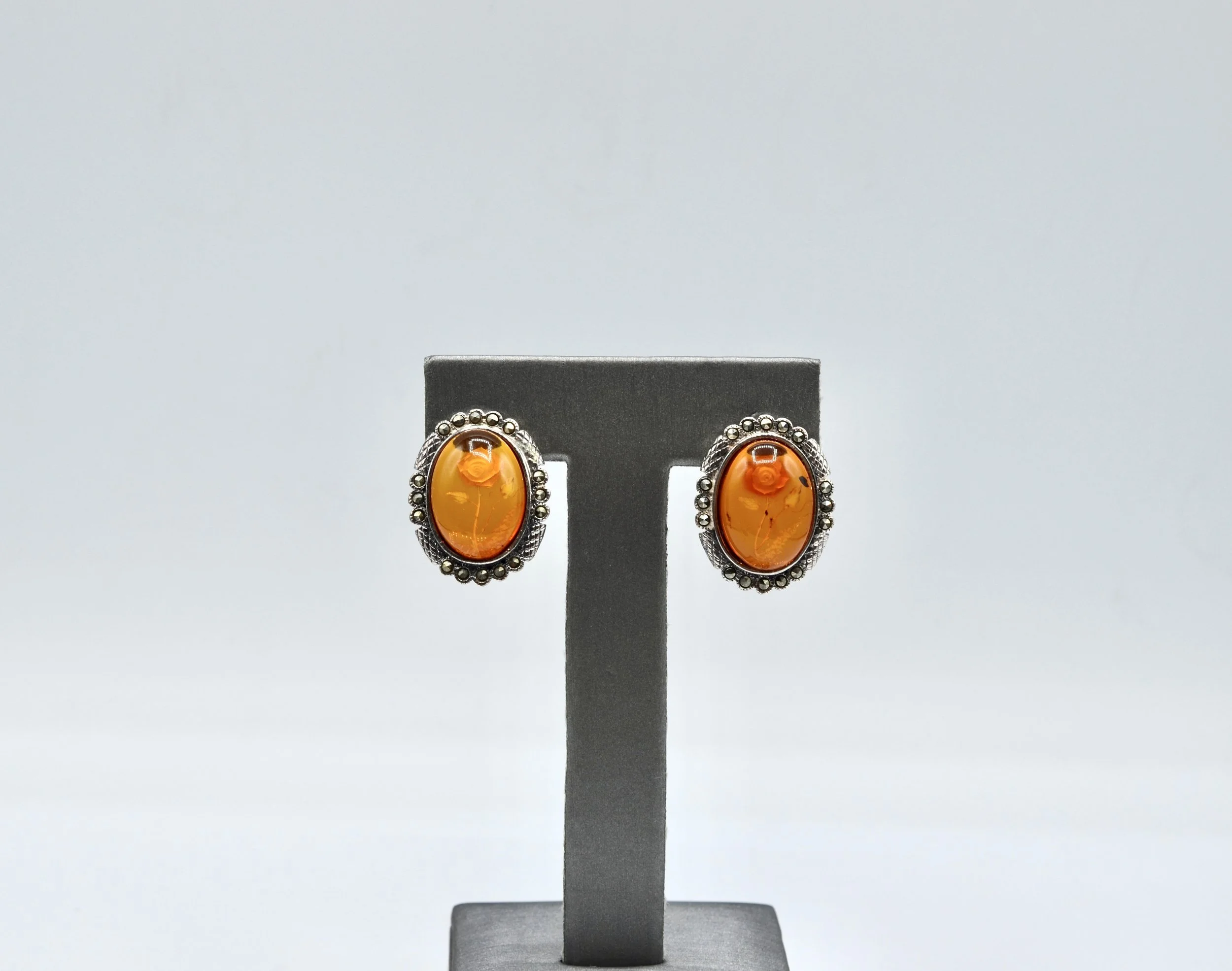 Vintage Sterling Silver Marcasite Amber Stone With Flower Earrings~~ 7.4gr