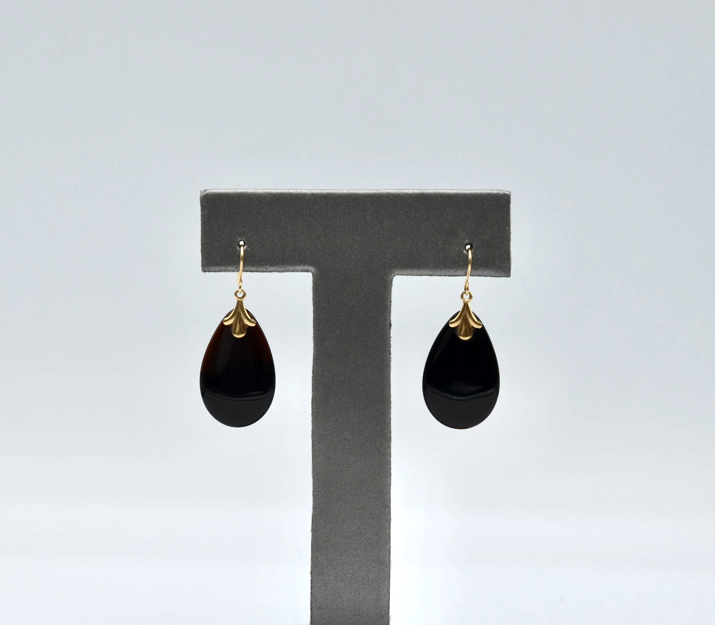 14k Vintage Gold Tear Drop Grey Mother Of Pearl And Onyx Earrings. 7.0gr